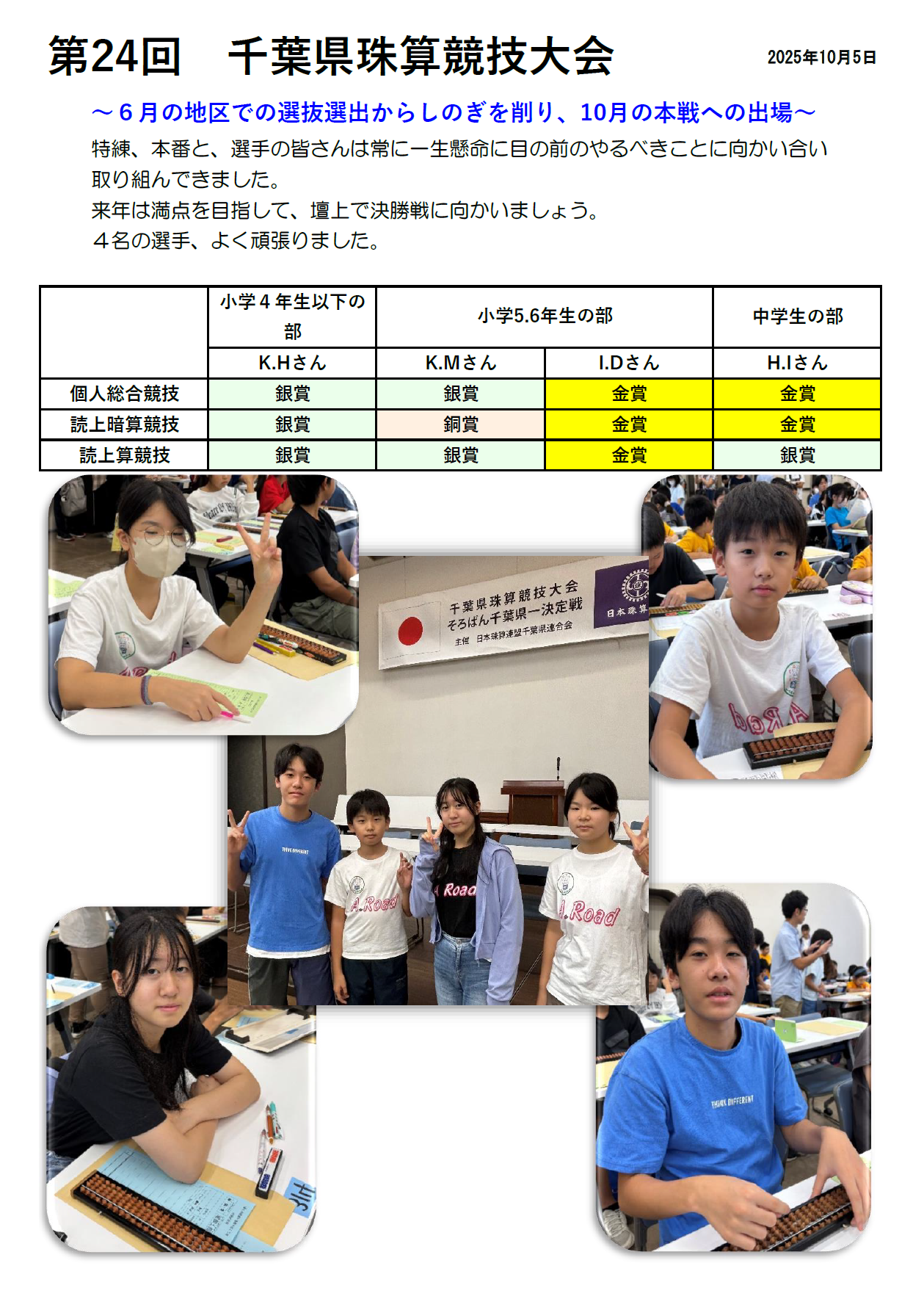 おたより 第24回 千葉県珠算競技大会 地区の予選を経て、本戦に出場したうさぎの4名の選手。 総合プリント競技では満点を目指し練習に取り組みました。練習では出せても、本番に満点を出すことの難しさも体験しました。 読上算、読上暗算は、聴く耳、音に遅れない速い指の動き、迷いのない運珠が必要、その練習にも一生懸命に取り組みました。 選手のみなさん、よく頑張りました。